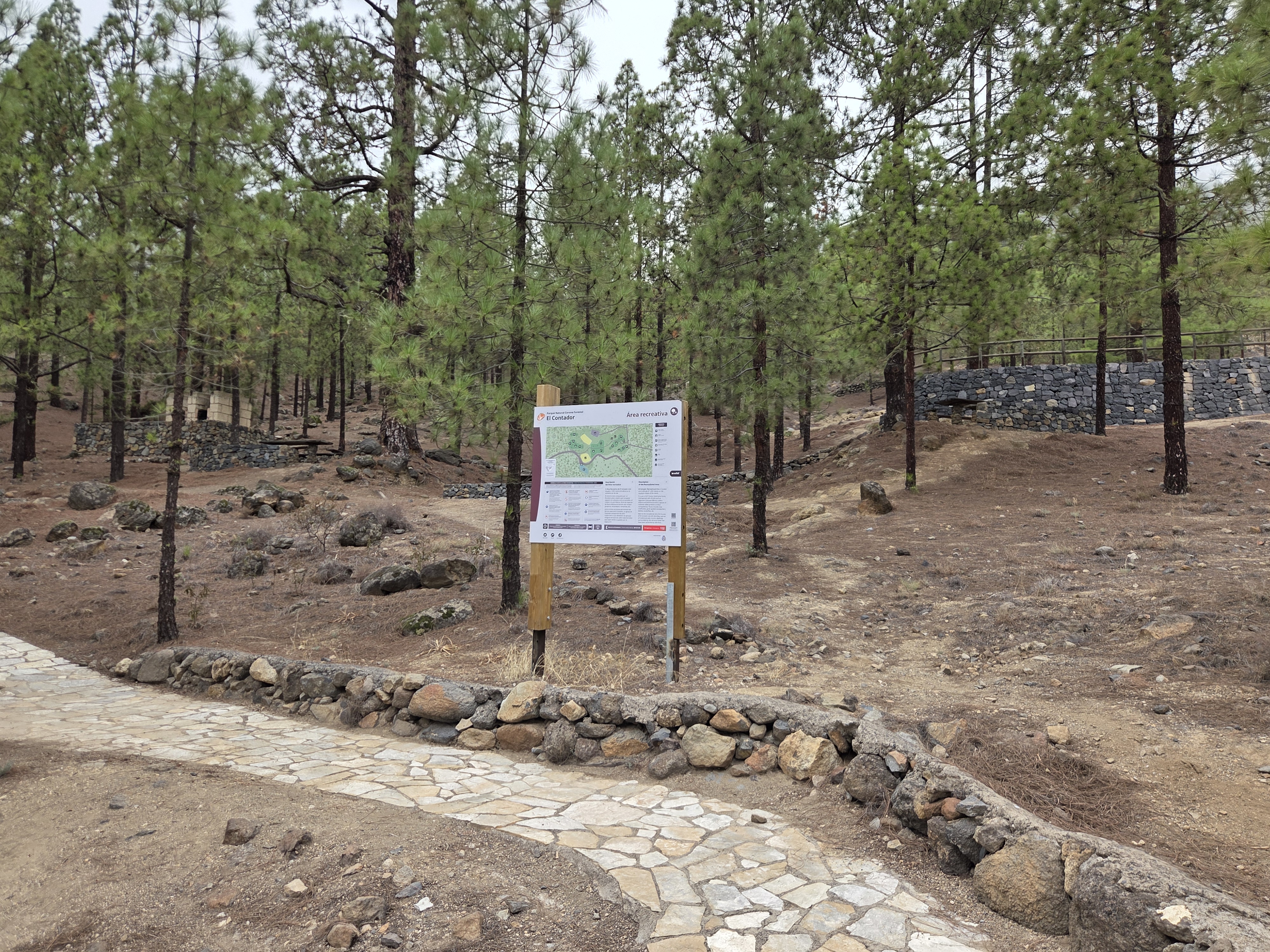 La randonnée est bien balisée avec des flèches blanches et jaunes. À l’aire récréative d’El Contador, un panneau présente la carte du secteur, les distances et les consignes de protection de l’environnement.