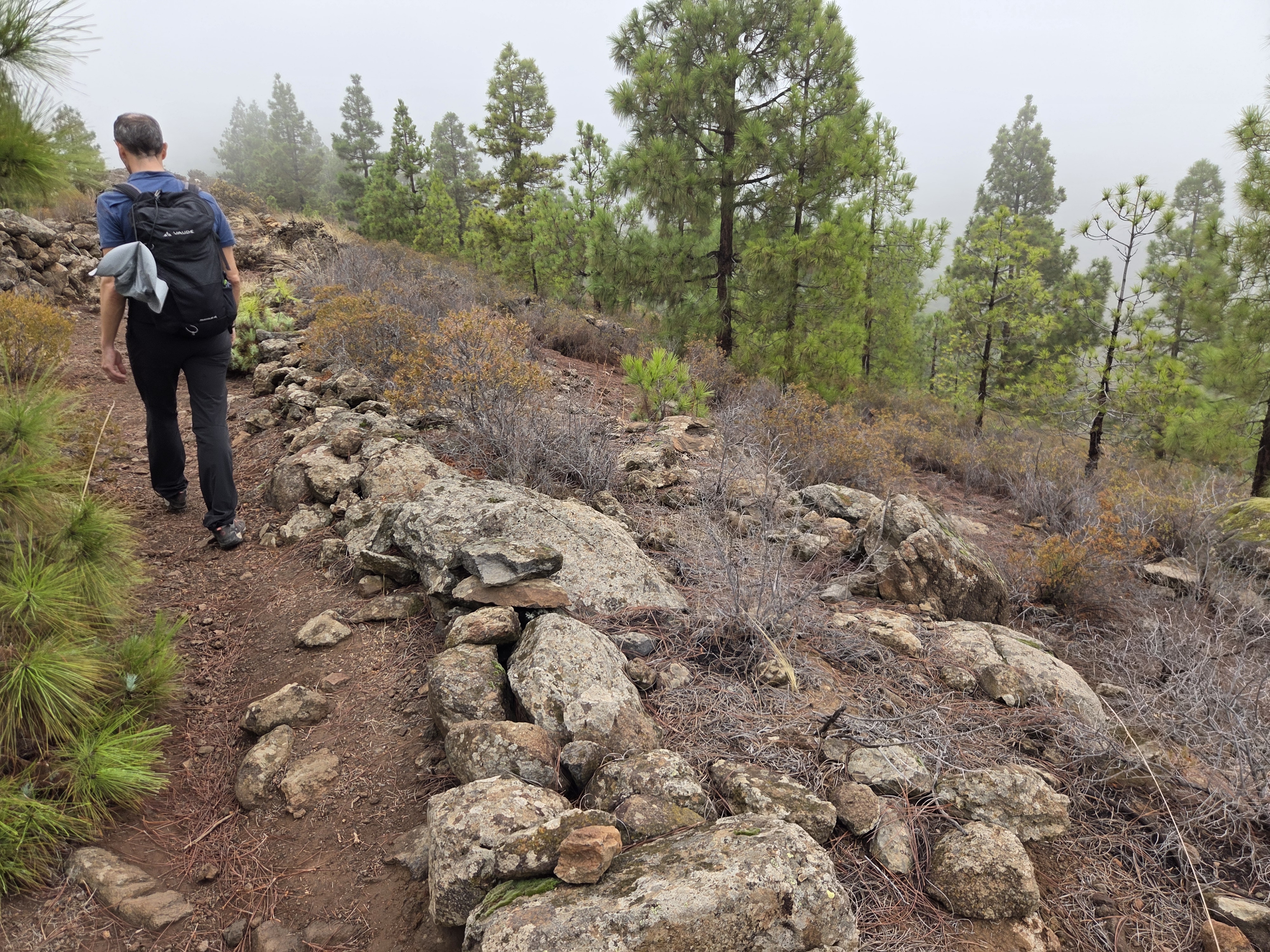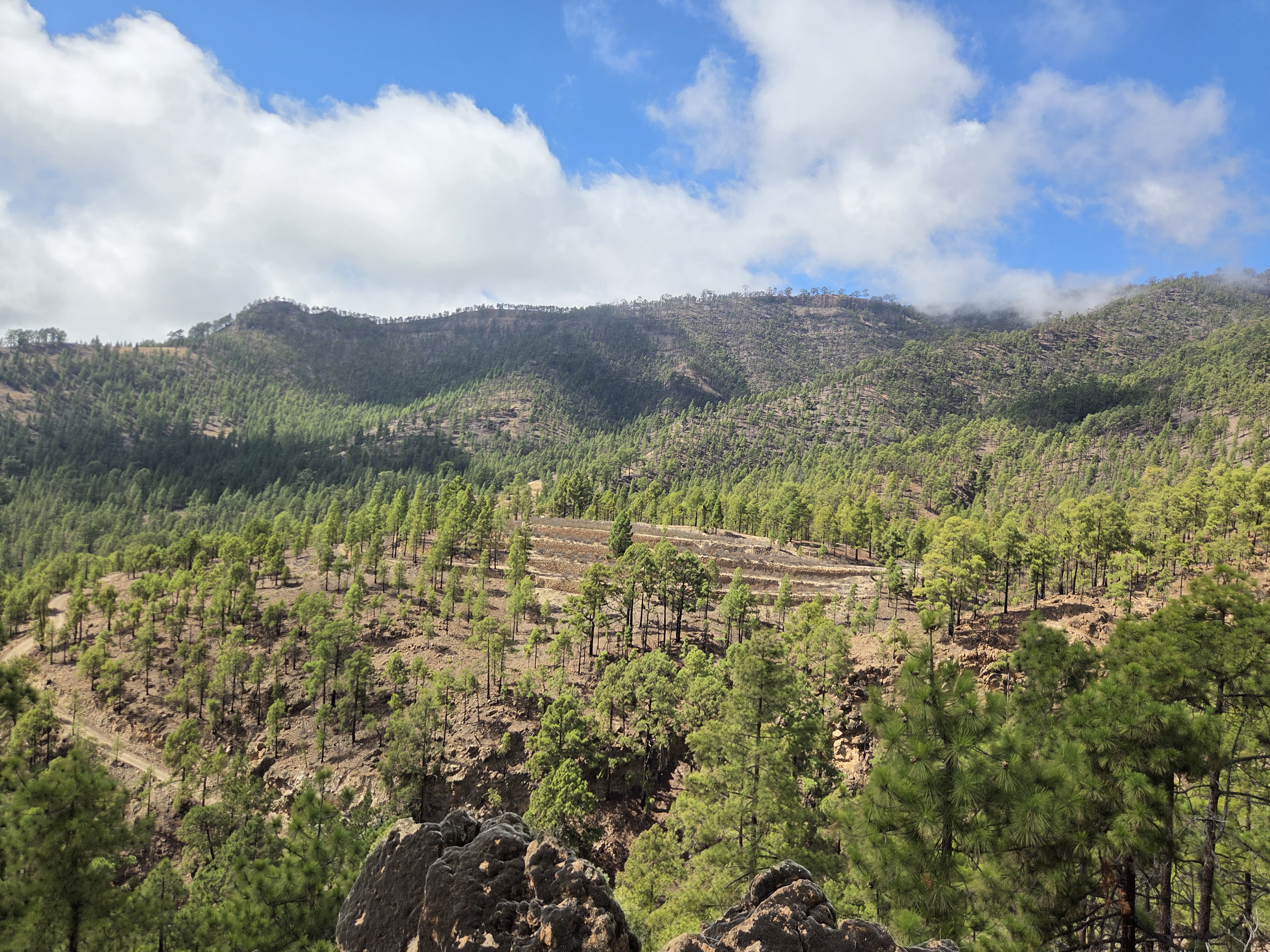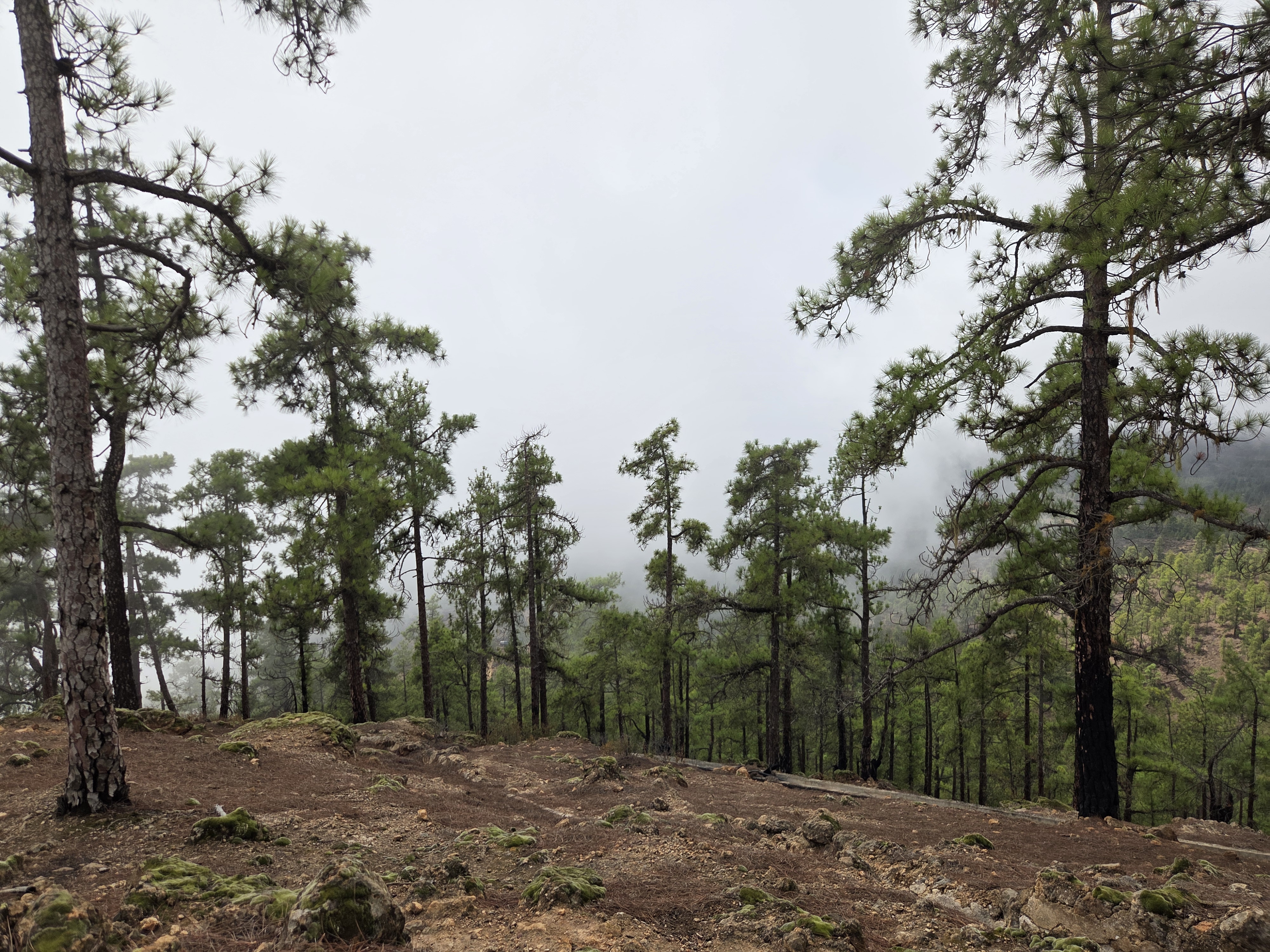 Le pin canarien, parfaitement adapté au feu, crée ici une forêt claire où l’on marche sur un tapis d’aiguilles. Le sentier ondule sans difficulté majeure, ponctué de points de vue sur les ravins voisins.