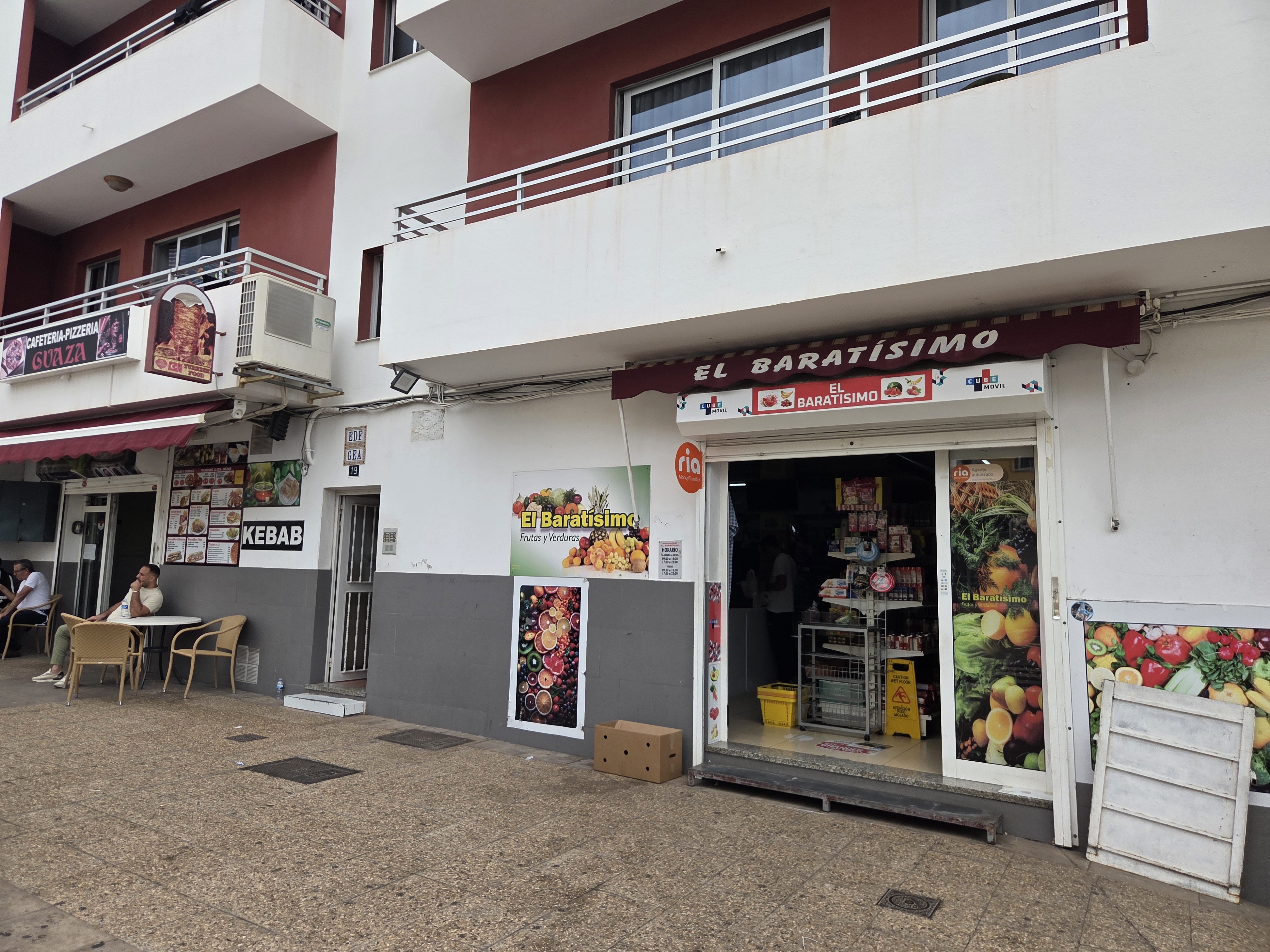 Au cœur de Guaza, les rues sont bordées de petits commerces de proximité. La supérette El Baratísimo propose fruits, légumes et produits de base, pratique pour faire quelques achats rapides. Juste à côté, un snack kebab et une cafétéria-pizzeria attirent habitants et travailleurs de la zone industrielle voisine.