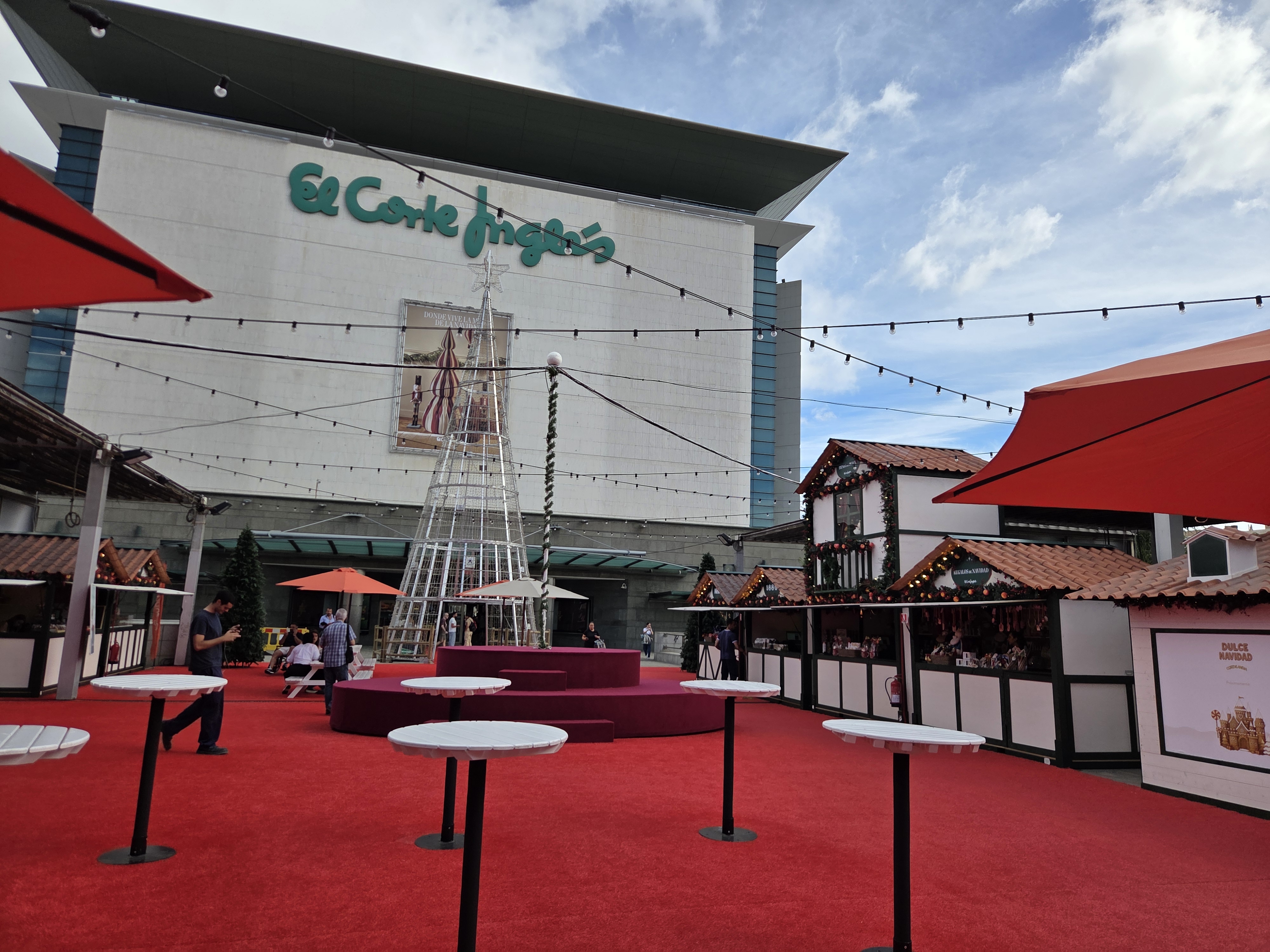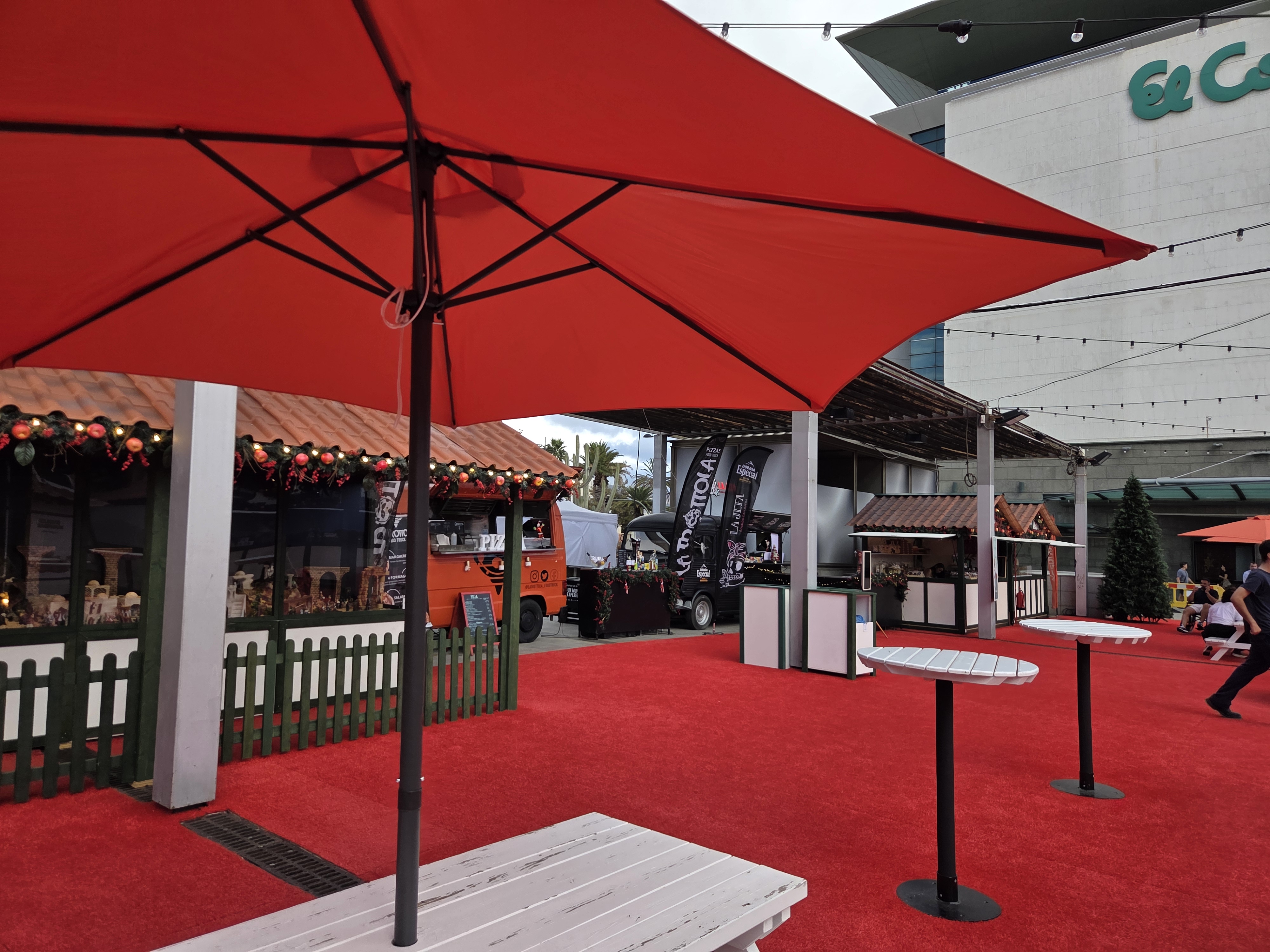 La première impression en arrivant sur la place est spectaculaire. Le tapis rouge qui recouvre tout l’espace extérieur, les guirlandes lumineuses suspendues au-dessus des visiteurs et les parasols colorés créent un décor moderne et élégant. La façade blanche d’El Corte Inglés domine la scène, renforçant l’idée d’un marché de Noël urbain, parfaitement intégré à la vie commerciale de Santa Cruz de Tenerife.