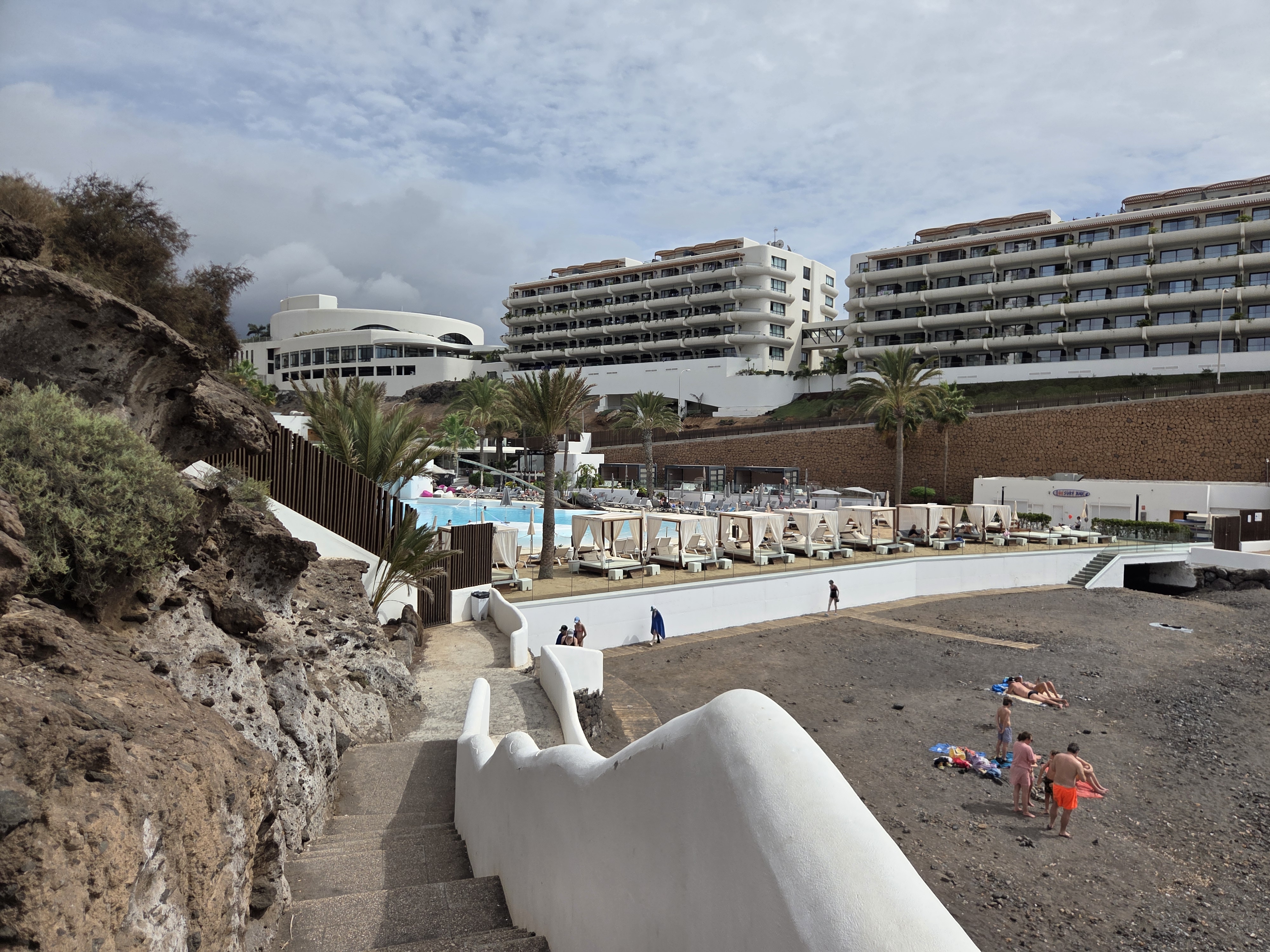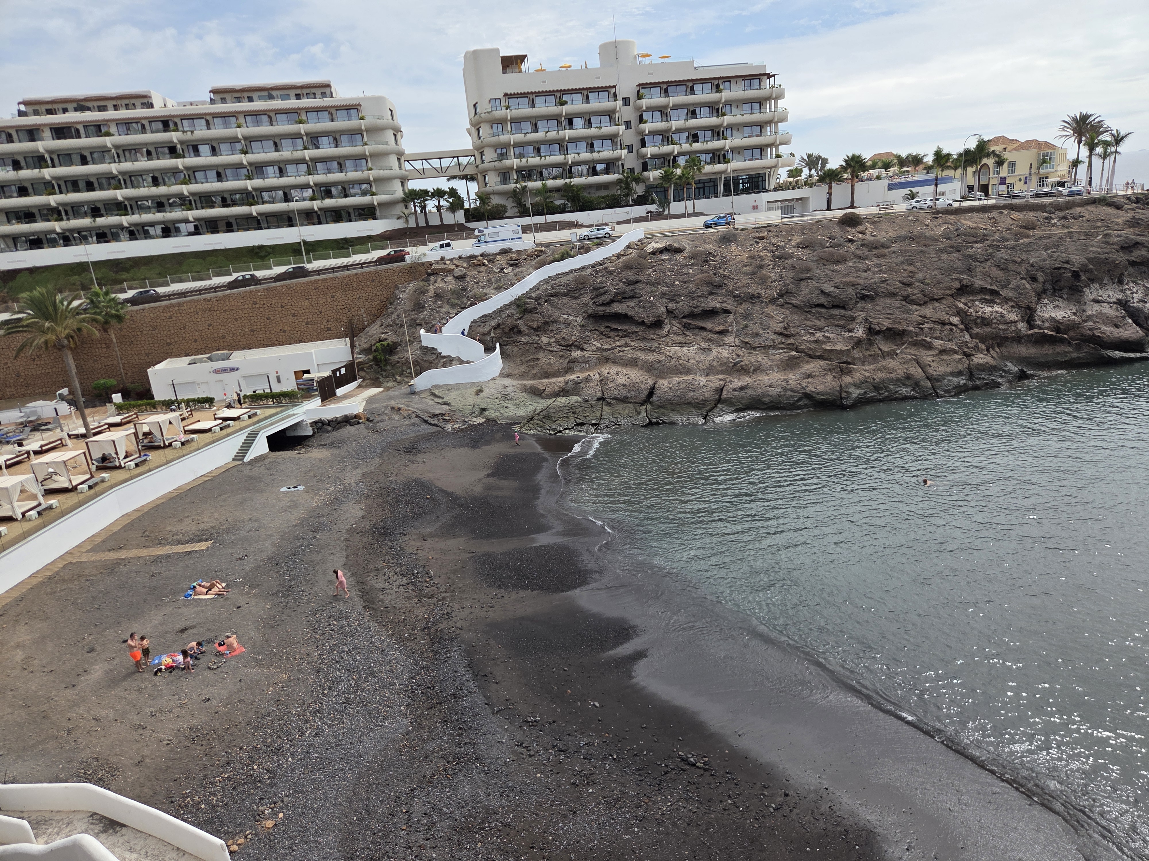 Playa El Pinque à Costa Adeje : petite crique protégée, sable volcanique et accès par escaliers blancs