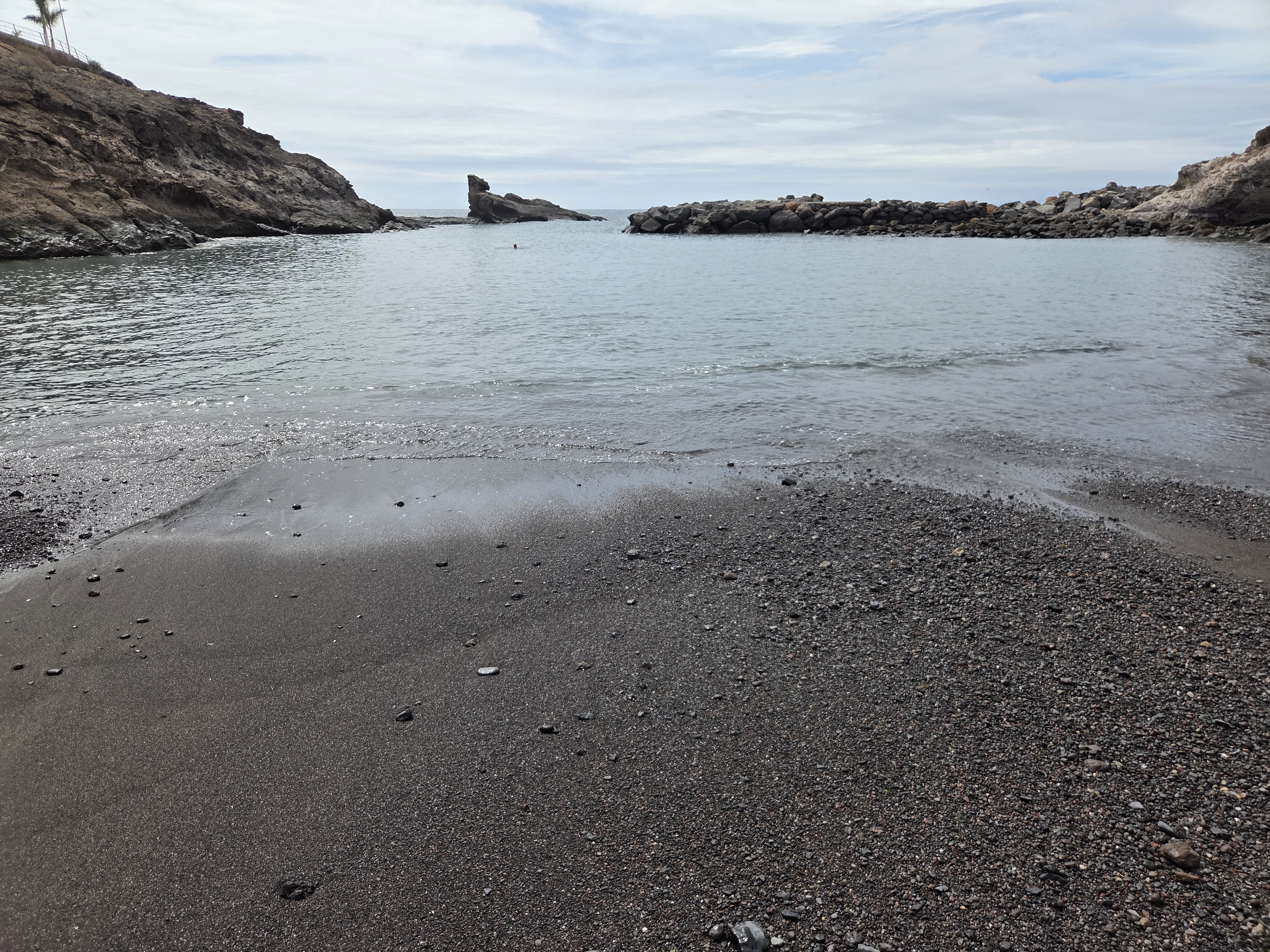 Le sable est un mélange de poudre basaltique et de petits galets. La pente est douce et, grâce aux rochers protecteurs, la mer est souvent plus plate qu’ailleurs sur la côte. Prévoir toutefois des chaussures d’eau pour le confort à l’entrée dans l’océan.