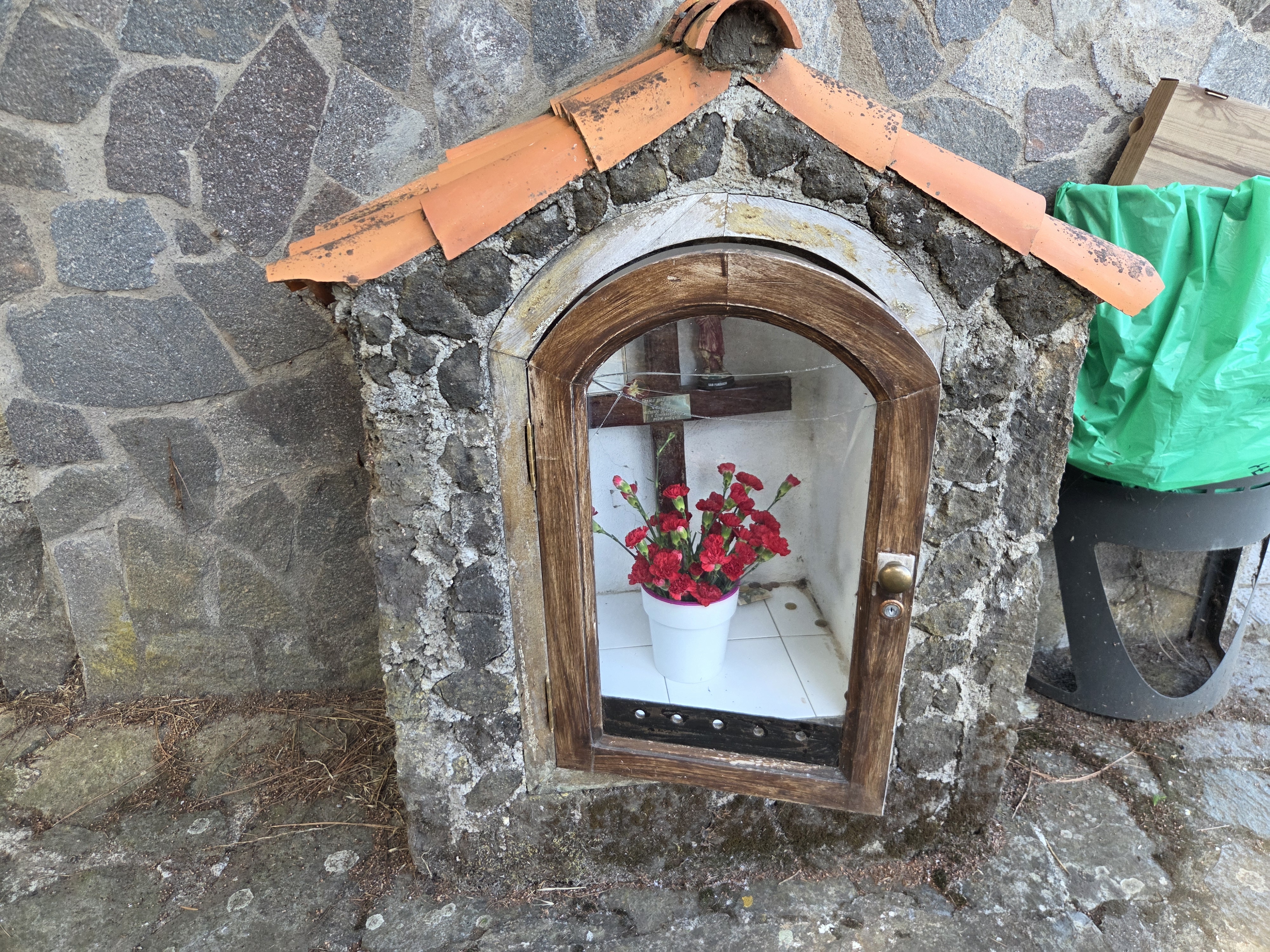 Au détour d’un mur, un petit oratoire rural rappelle la culture locale et la relation des habitants à la montagne.