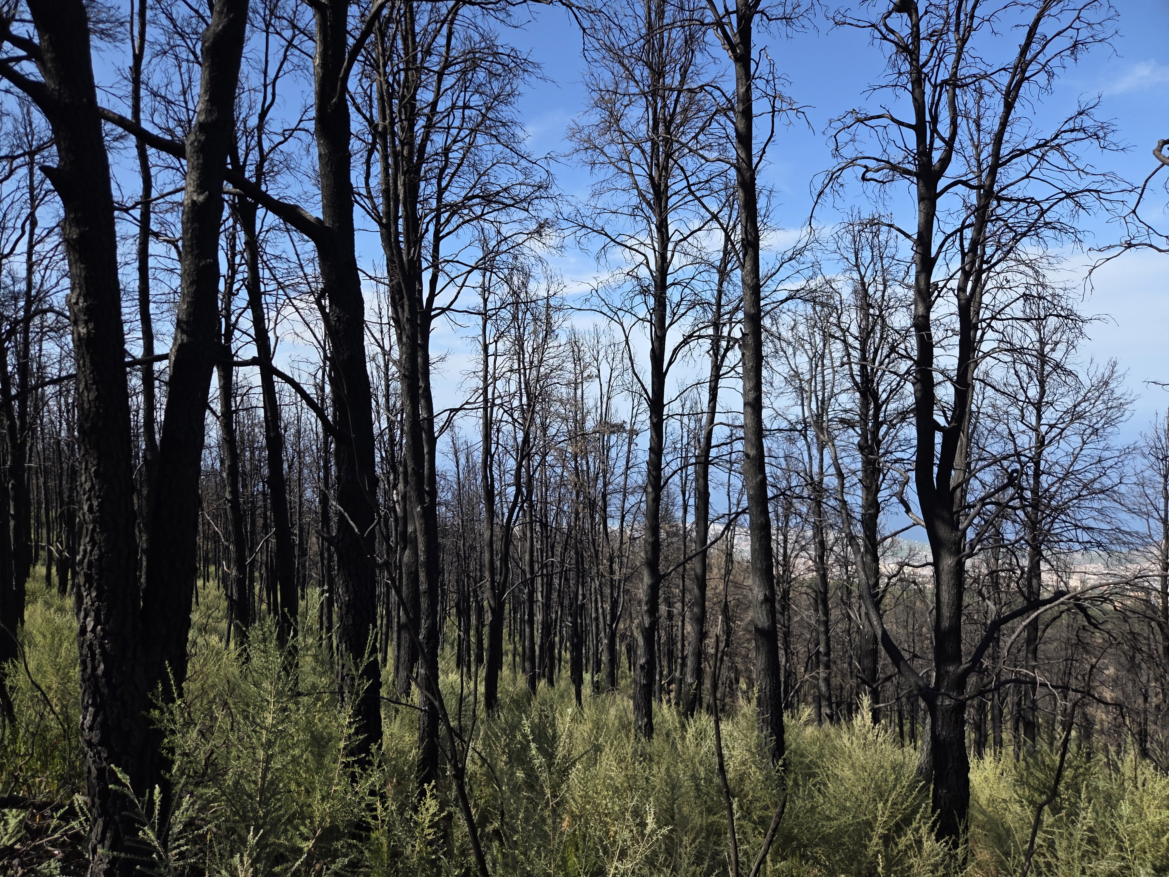 On traverse une zone touchée par des incendies passés : troncs noircis et sous-bois verdissant illustrent la résilience de l’écosystème insulaire.