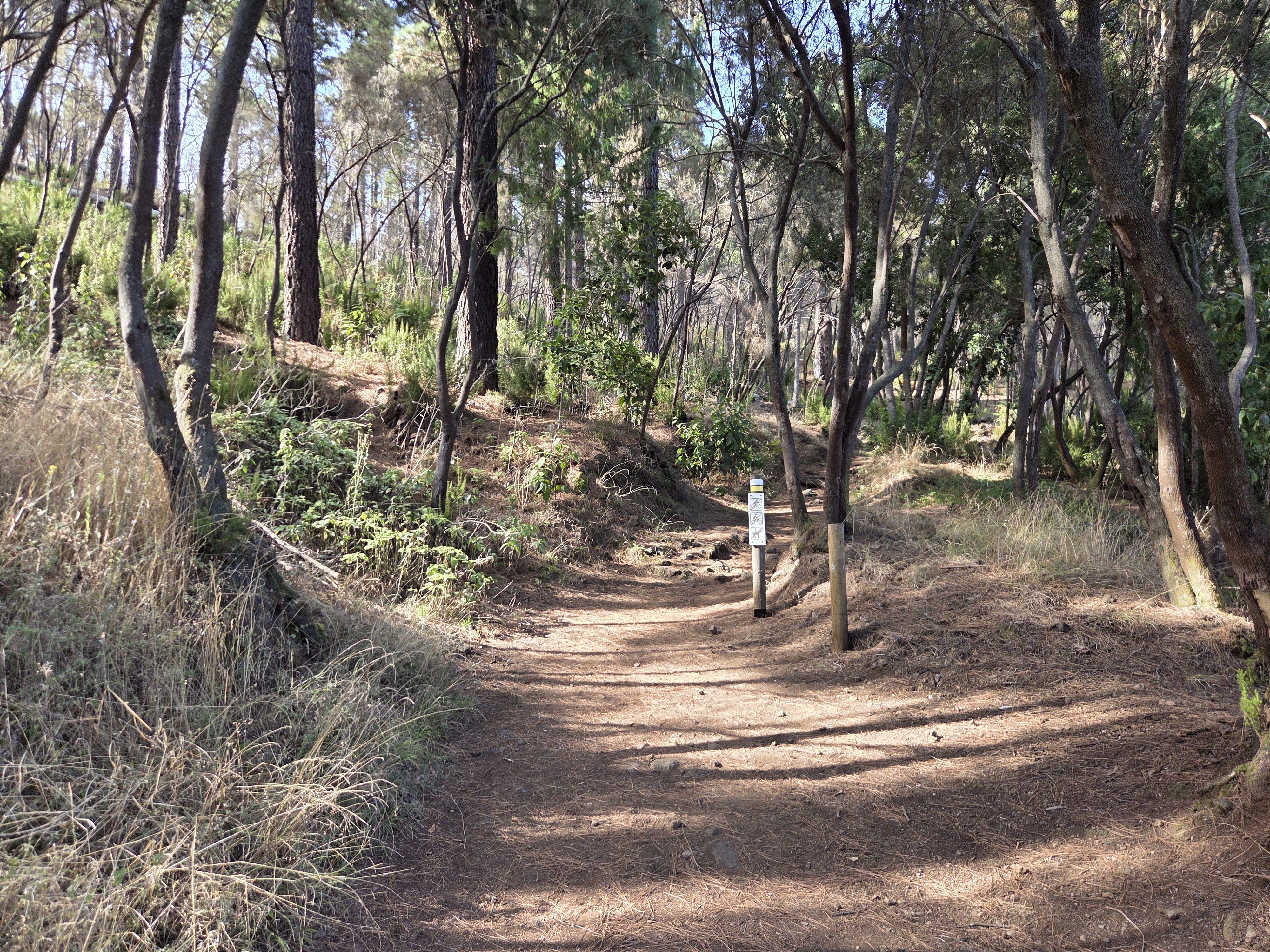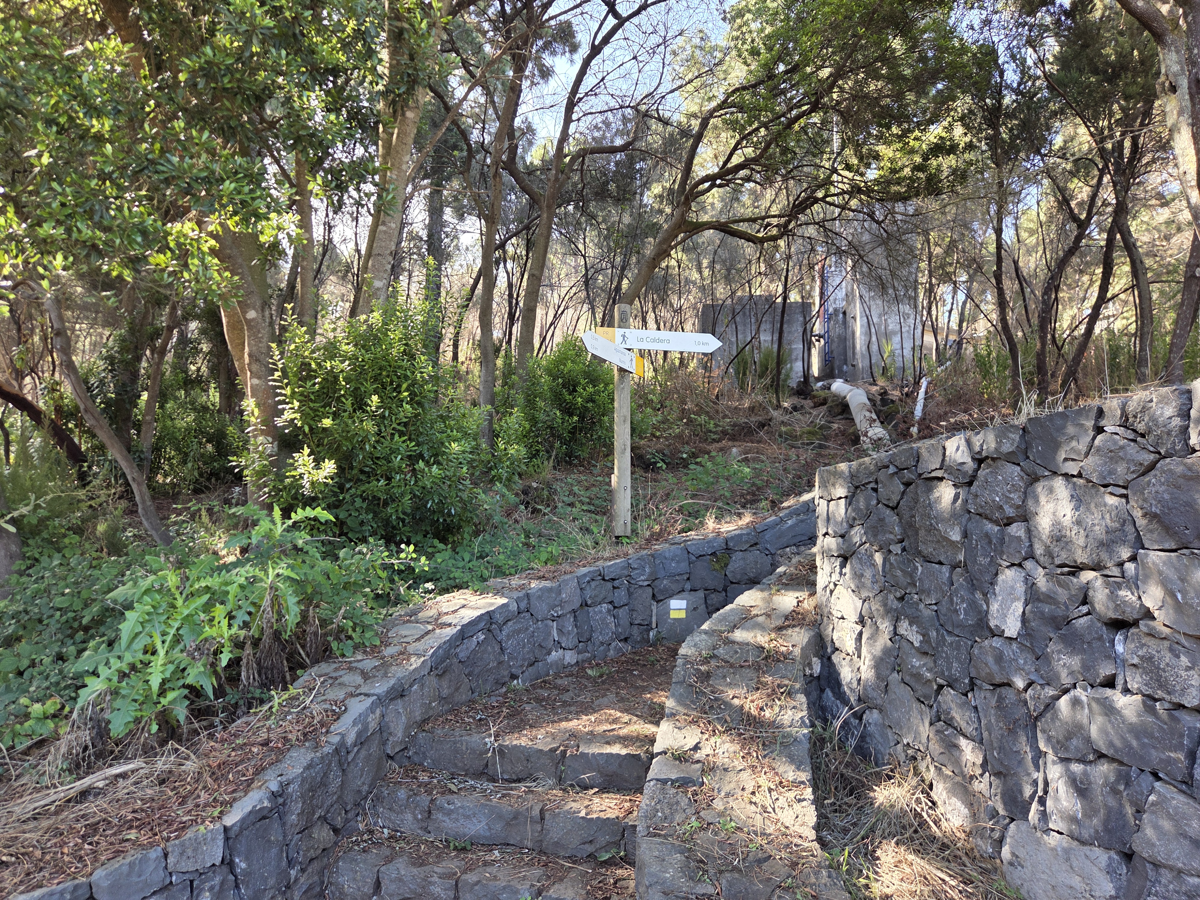 Par endroits, de petits escaliers et des murets en pierre volcanique stabilisent le terrain. Ils s’intègrent parfaitement au paysage de pins et de lauriers.